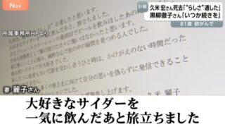麗子さんは「大好きなサイダーを一気に飲んだあと、旅立ちました。まるでニュースステーションの最終回でビールを飲みほしたあの時のように」と思い出を振り返った。 pic.twitter.com/AviIImKFR0