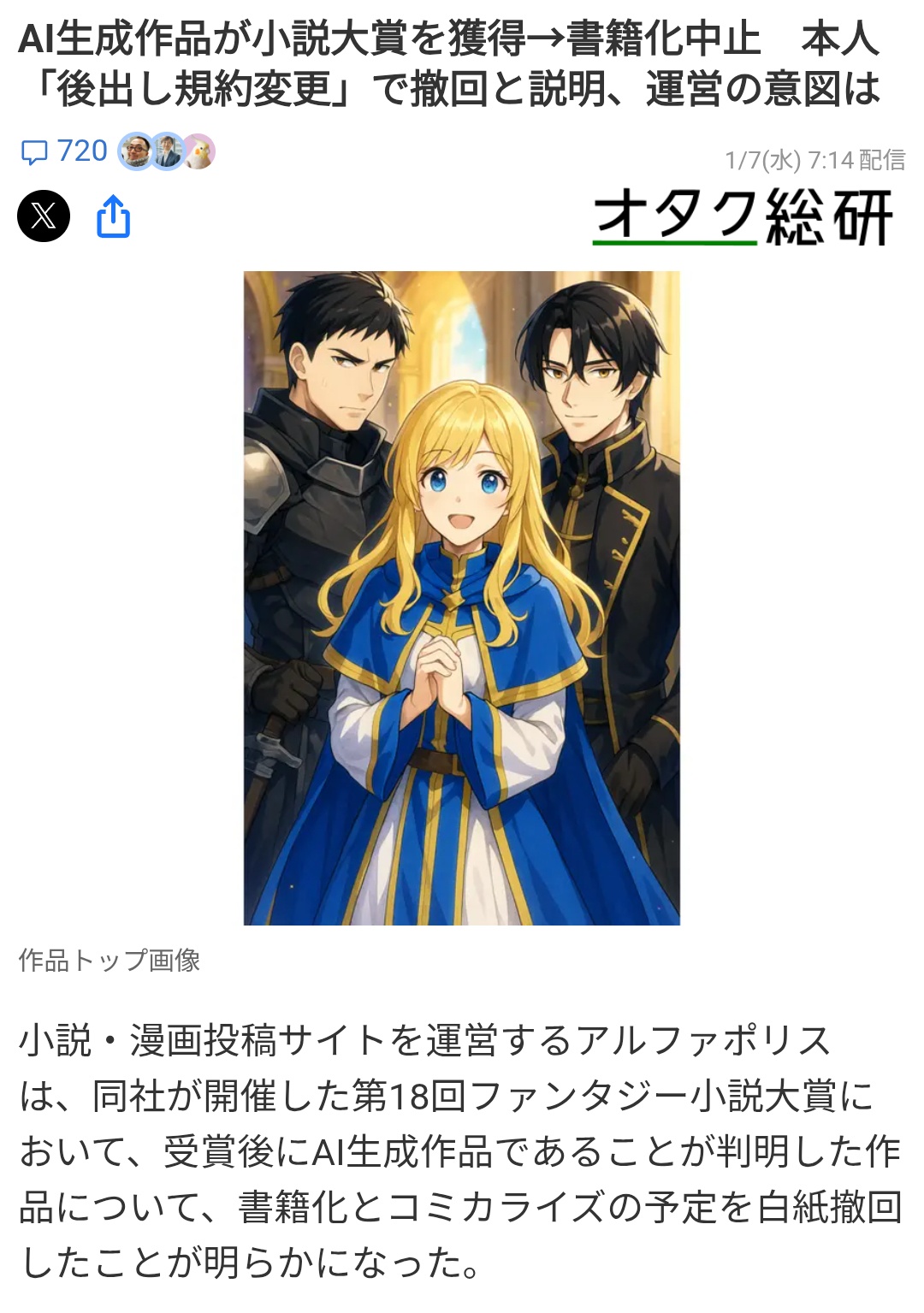 AI生成小説がファンタジー小説大賞受賞㊗ Twitter Facebook はてブ LINE コピー 2026.01.14 スポンサーリンク 1 : 以下、?ちゃんねるからVIPがお送りします :2026/01/13(火) 14:31:15.331 ID:v+mNaFA70.netAI生成作品が小説大賞を獲得→書籍化中止 本人「後出し規約変更」で撤回と説明、運営の意図は(オタク総研) - Yahoo!ニュースhttps://news.yahoo.co.jp/articles/effe2ef807f73d172b42dbd81b26ef033a693976転載元スレッド:https://viper.2ch.sc/test/read.cgi/news4vip/1768282275/ 続きを読む