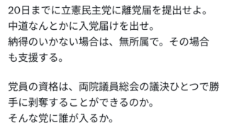 20日までに立憲民主党に離党届を提出せよ。