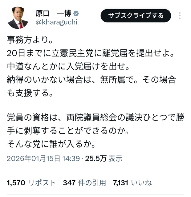 — 原口 一博 (@kharaguchi) January 15, 2026