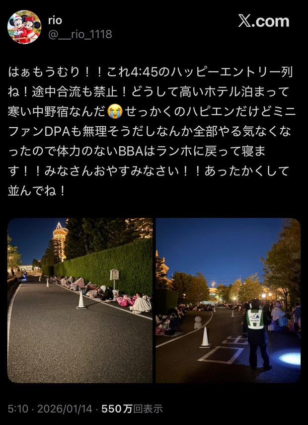 はぁもうむり!!これ4:45のハッピーエントリー列ね!途中合流も禁止!どうして高いホテル泊まって寒い中野宿なんだ😭せっかくのハピエンだけどミニファンDPAも無理そうだしなんか全部やる気なくなったので体力のないBBAはランホに戻って寝ます!!みなさんおやすみなさい!!あったかくして並んでね! pic.twitter.com/PSZP8xIfuy