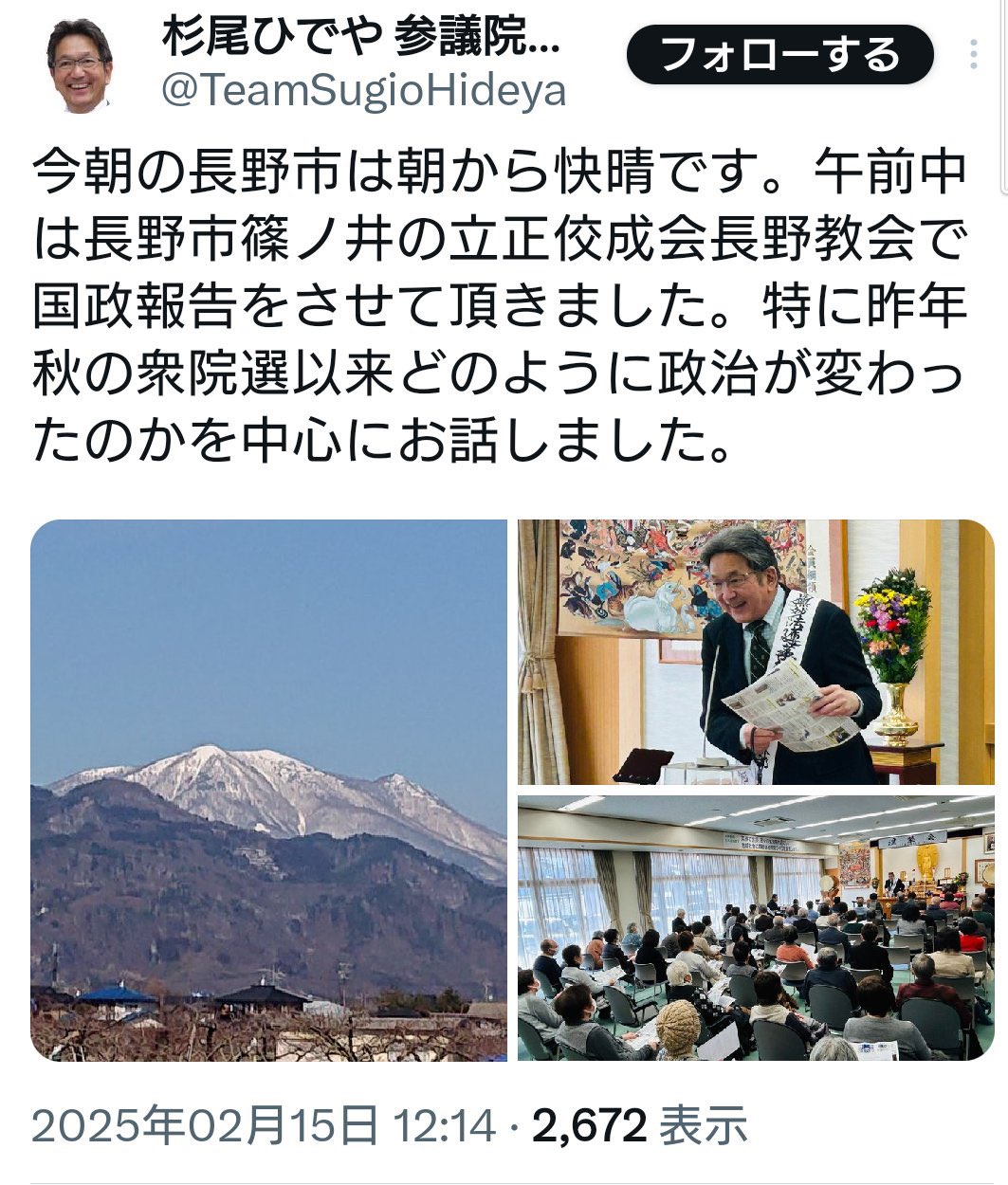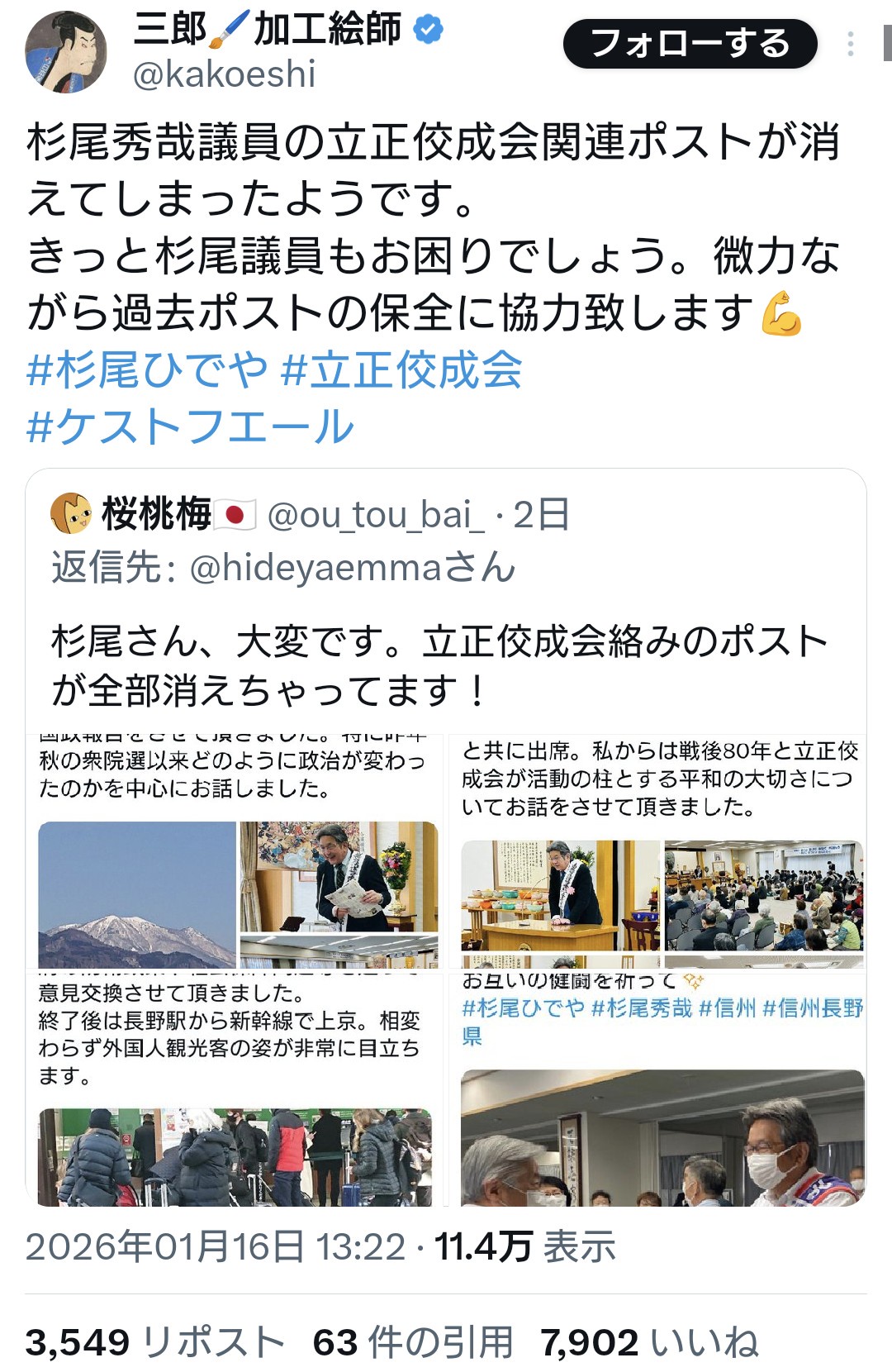 立憲民主党の杉尾秀哉参院議員が、立正佼成会関連の投稿を削除したことが明らかになりました。公明党との新党結成の動きの中で、創価学会への忖度か?と話題になっています。