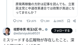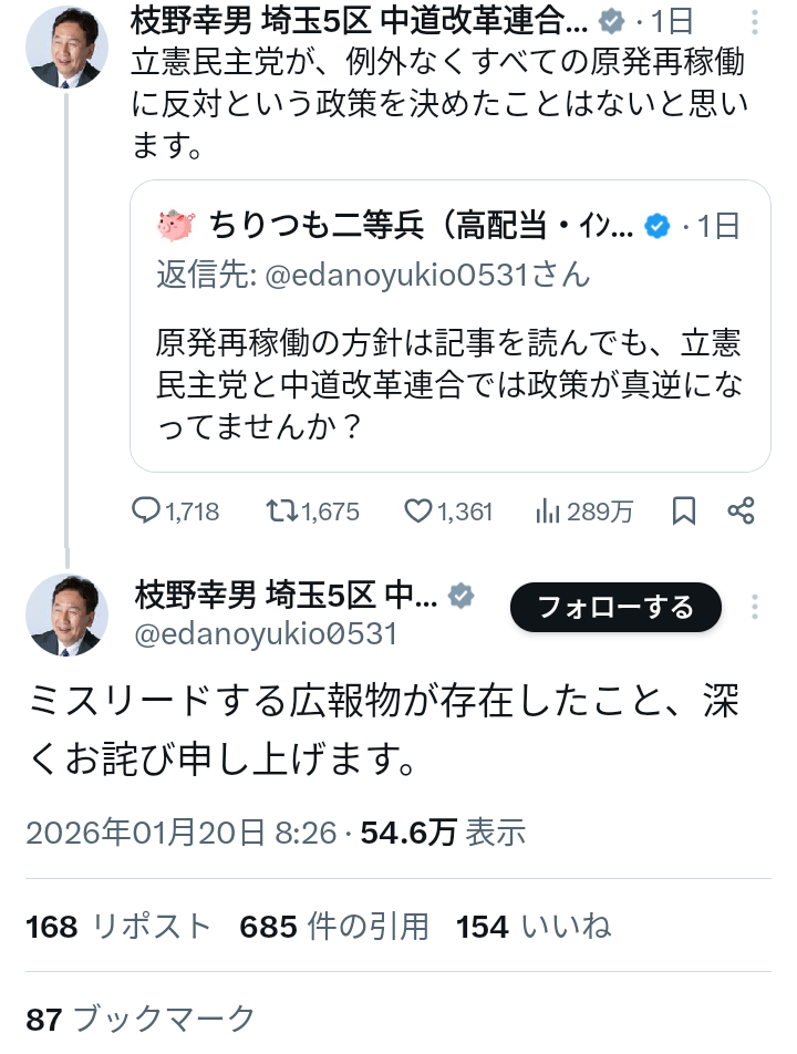 【悲報】枝野幸男さん、立憲民主党が全ての原発再稼働に反対するミスリードがあったことを認め謝罪 Twitter Facebook はてブ LINE コピー 2026.01.20 スポンサーリンク 1:それでも動く名無し:2026/01/20(火) 14:09:06.87 ID:fSau8qu70 あたかも全ての原発再稼働に反対していると見せかけているミスリードの広報 2:それでも動く名無し:2026/01/20(火) 14:10:37.10 ID:6laQAcYeH 辺野古も容認になったから沖縄の左翼が中道にガチギレしとるな 5:それでも動く名無し:2026/01/20(火) 14:14:58.97 ID:8vI8GuB20 >>2 勝手に勘違いしてただけやん 日本が原発無しでやっていけるなんて思ってる奴は居ないやろ 続きを読む