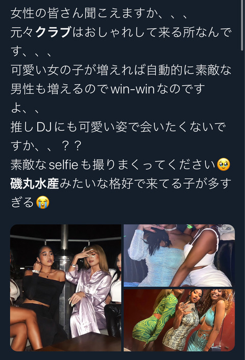 まんさん「磯丸水産みたいな服装でクラブ来るの辞めて」 Twitter Facebook はてブ LINE コピー 2022.04.14 スポンサーリンク 1:風吹けば名無し:2022/04/14(木) 14:33:18.93 ID:5YJtWdua0.net 別にええやろ… 3:風吹けば名無し:2022/04/14(木) 14:34:02.63 ID:k5ZQMYQu0.net どういう意味や 4:風吹けば名無し:2022/04/14(木) 14:34:12.94 ID:U8491/6W0.net 磯丸水産の格好ってなんや?? 続きを読む