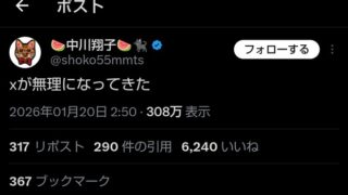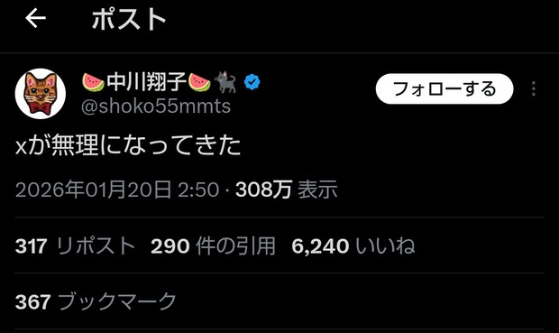 【悲報】中川翔子さん「Xが無理になってきた」 Twitter Facebook はてブ LINE コピー 2026.01.20 スポンサーリンク 1 : 以下、?ちゃんねるからVIPがお送りします :2026/01/20(火) 12:53:53.887 ID:79yG+M1N0.netxが無理になってきた— 🍉中川翔子🍉🐈⬛ (@shoko55mmts) January 19, 2026お前らが追い込みすぎた結果転載元スレッド:https://viper.2ch.sc/test/read.cgi/news4vip/1768881233/ 続きを読む