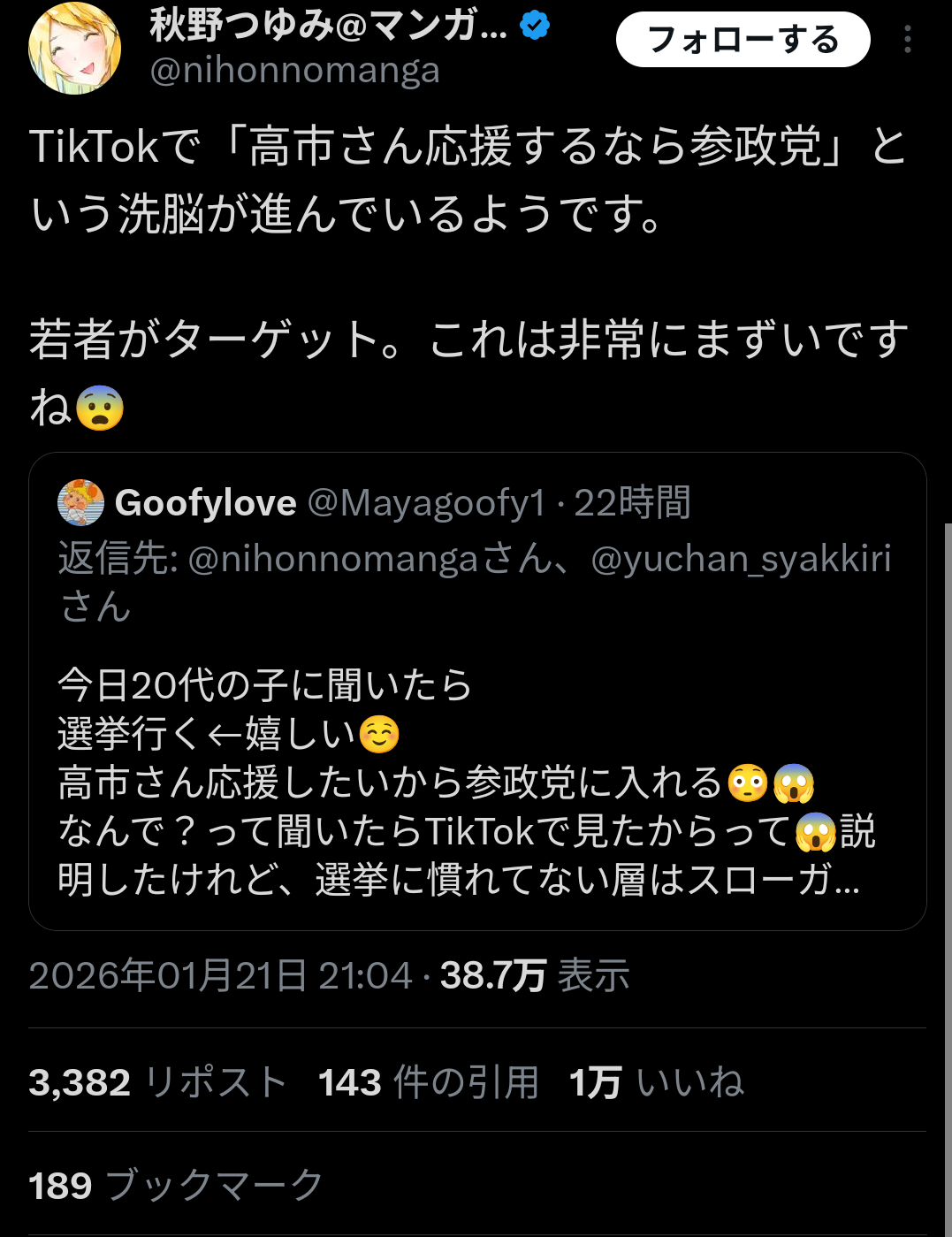 【悲報】「高市さんを応援するなら参政党」とかいうトンデモ情報、TikTokで大拡散されてしまうwwwwwwwwwww Twitter Facebook はてブ LINE コピー 2026.01.22 スポンサーリンク 1:それでも動く名無し:2026/01/22(木) 18:52:18.89 ID:O2nl33aBr 2:それでも動く名無し:2026/01/22(木) 18:52:33.73 ID:O2nl33aBr どうすんのこれ 3:それでも動く名無し:2026/01/22(木) 18:52:54.80 ID:O2nl33aBr 保守票割れて中道改革に有利に働きそうやが 続きを読む