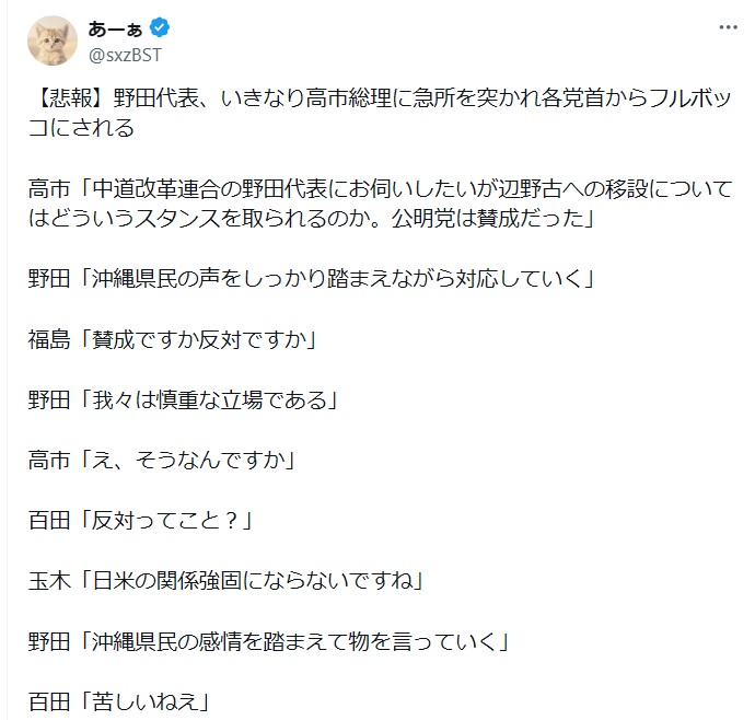 野田「沖縄県民の感情を踏まえて物を言っていく」