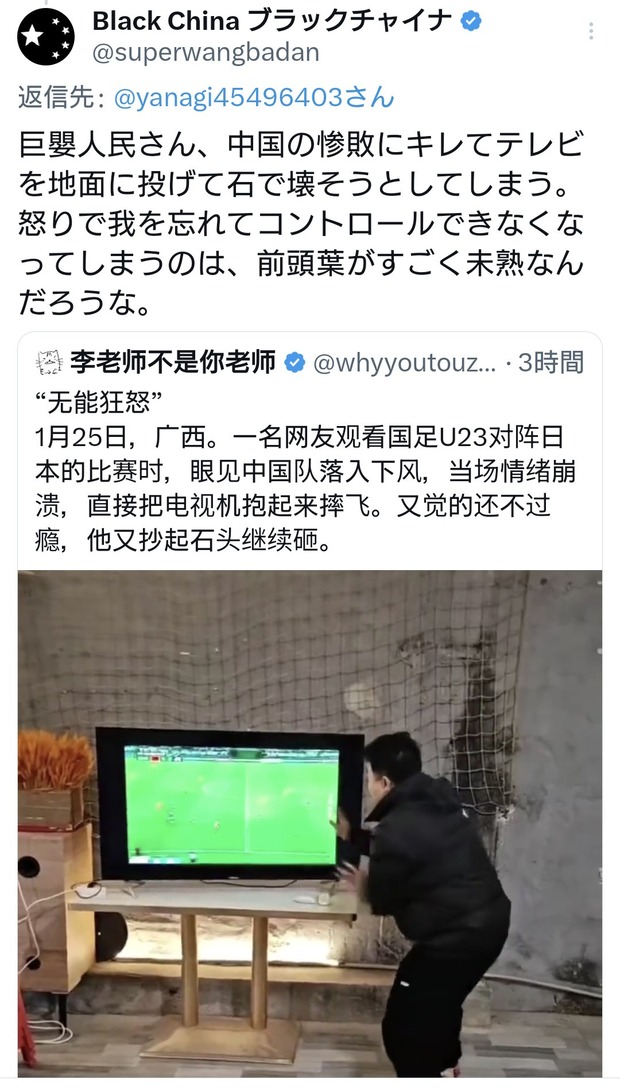 巨嬰人民さん、中国の惨敗にキレてテレビを地面に投げて石で壊そうとしてしまう。