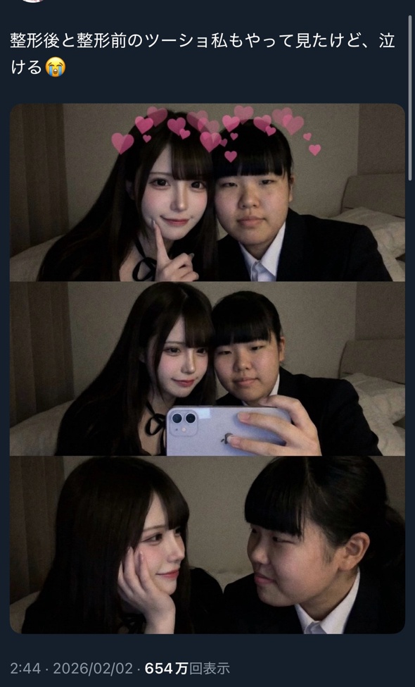 【画像】女さん「整形後と整形前のツーショ私もやって見たけど、泣ける😭」 Twitter Facebook はてブ LINE コピー 2026.02.02 スポンサーリンク 1:それでも動く名無し:2026/02/02(月) 16:15:12.51 ID:XDVhJwxU00202 2:それでも動く名無し:2026/02/02(月) 16:16:12.46 ID:x2QwOeMLd0202 うわあ... 3:それでも動く名無し:2026/02/02(月) 16:16:22.24 ID:cYmE+Q8t00202 努力したんだね 続きを読む