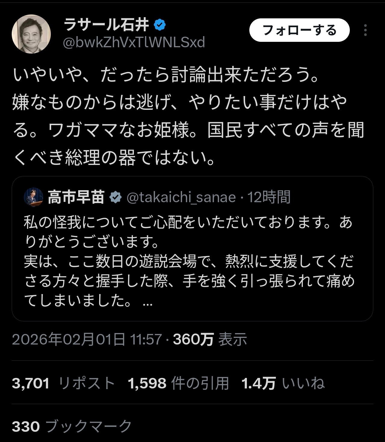 ラサール石井さん関節リウマチの治療のために欠席した高市早苗に対して言い放ってしまうwwwwwwwwwwwww Twitter Facebook はてブ LINE コピー 2026.02.03 スポンサーリンク 1:以下、?ちゃんねるからVIPがお送りします:2026/02/01(日) 22:58:16.473 ID:sRRp+N550 いいか?難病の病気の治療で休むのはワガママなんだぞ!? 2:以下、?ちゃんねるからVIPがお送りします:2026/02/01(日) 22:59:41.894 ID:EVrB4JMr0 関節リウマチってガチで痛いやつじゃん 3:以下、?ちゃんねるからVIPがお送りします:2026/02/01(日) 22:59:47.216 ID:O+wUXvI/0 討論は行けないけど演説はできますは謎 続きを読む