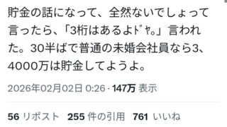 貯金の話になって、全然ないでしょって言ったら、「3桁はあるよドヤ。」言われた。30半ばで普通の未婚会社員なら3、4000万は貯金してようよ。