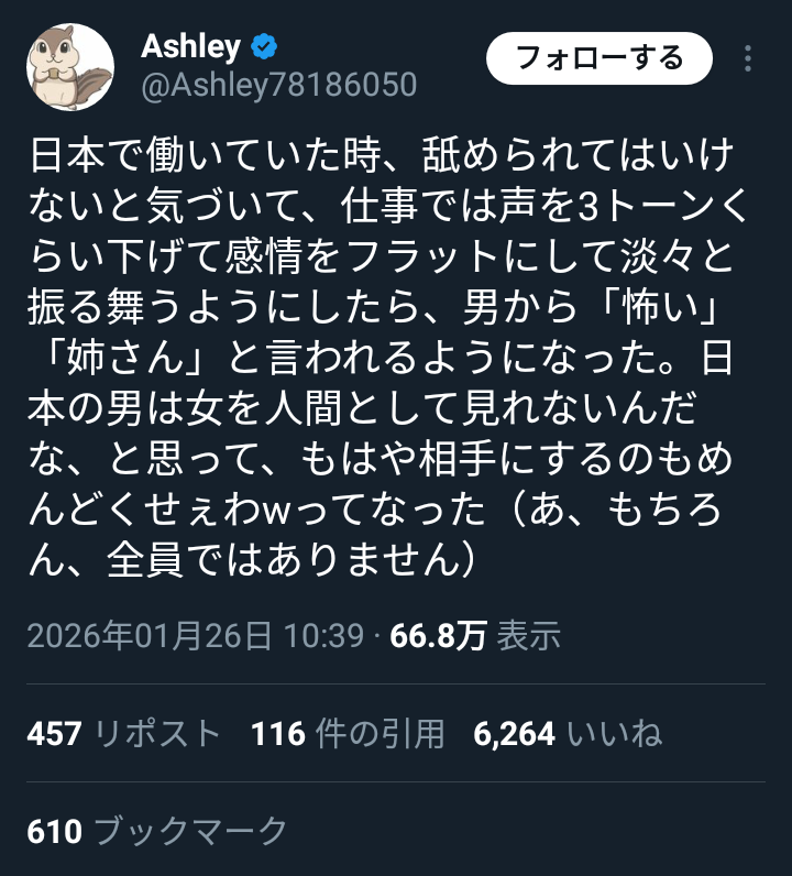 日本で働いていた時、舐められてはいけないと気づいて、仕事では声を3トーンくらい下げて感情をフラットにして淡々と振る舞うようにしたら、男から「怖い」「姉さん」と言われるようになった。日本の男は女を人間として見れないんだな、と思って、もはや相手にするのもめんどくせぇわwってなった(あ、…