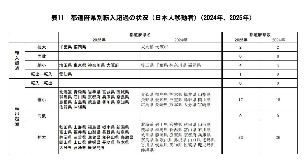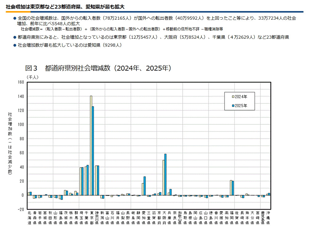 2025年、社会増加数は愛知県が最も拡大。