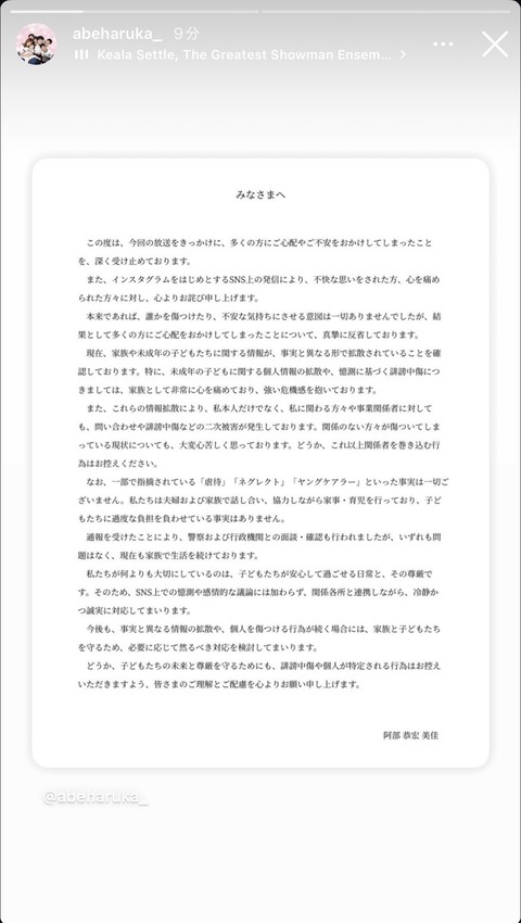 現在、家族や未成年の子どもたちに関する情報が、事実と異なる形で拡散されていることを確認しております。特に、未成年の子どもに関する個人情報の拡散や、憶測に基づく誹謗中傷につきましては、家族として非常に心を痛めており、強い危機感を抱いております。