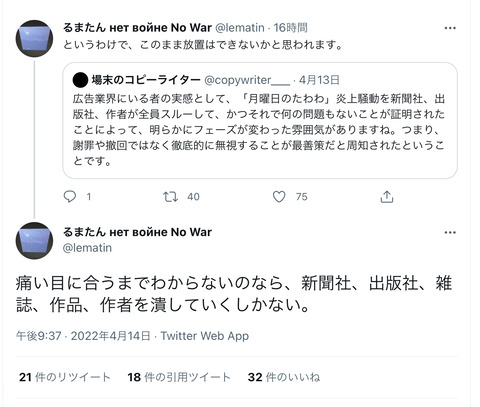 フェミニズム女性「ガチでキレたわ。新聞社、出版社、雑誌、作品、作者、全部潰す」 Twitter Facebook はてブ LINE コピー 2022.04.15 スポンサーリンク 1:風吹けば名無し:2022/04/15(金) 22:19:33 2:風吹けば名無し:2022/04/15(金) 22:19:41 こわすぎる… 3:風吹けば名無し:2022/04/15(金) 22:19:54 これもう文化大革命だろ… 続きを読む