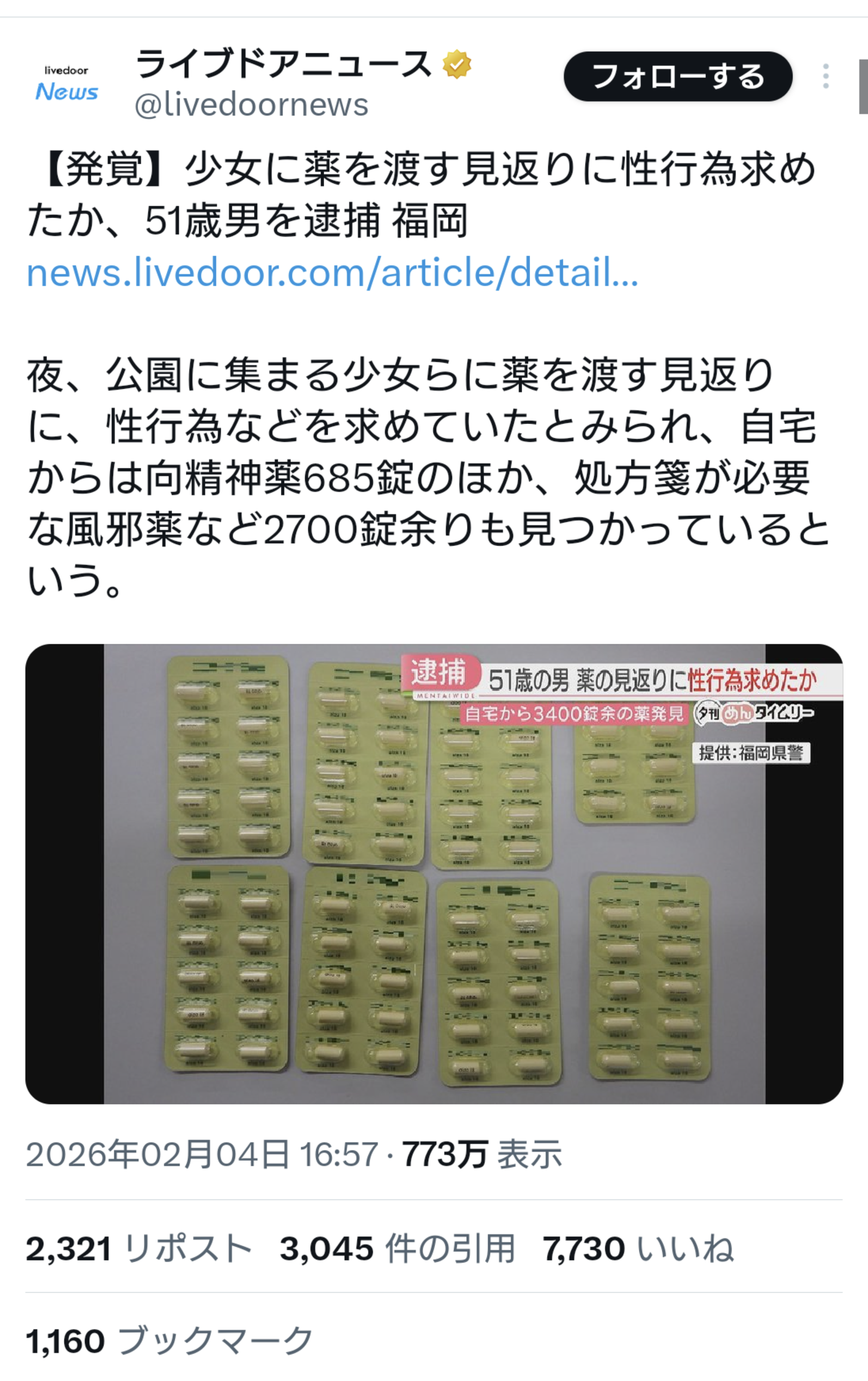 【悲報】51歳の爺、薬を少女に渡す見返りに性行為を求めて逮捕