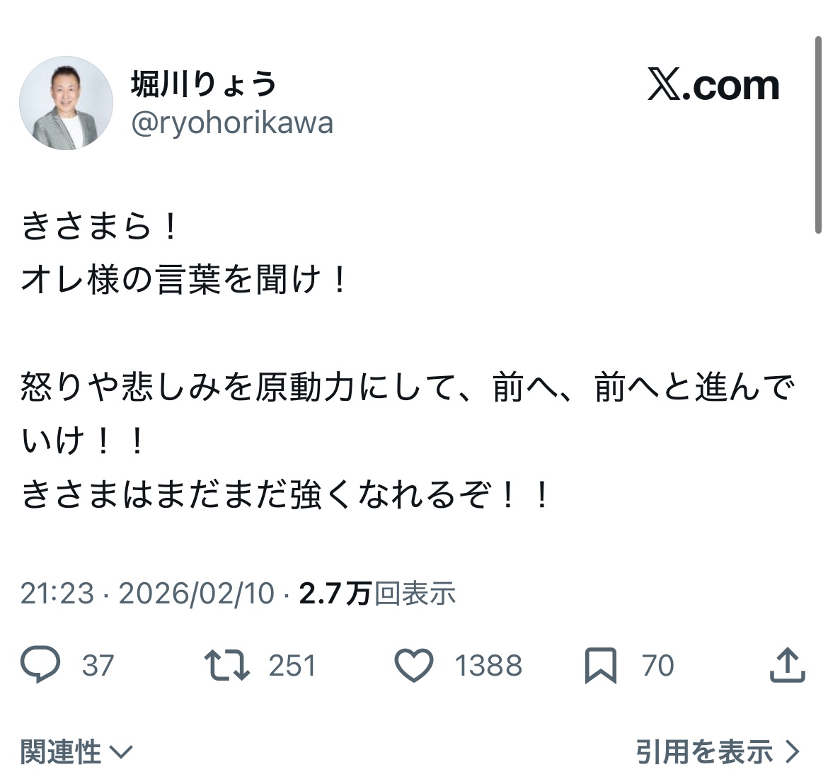 【悲報】ベジータ(堀川りょう)さん、あっち側だったwwwwwwwwwwwwwwwwwwwwwwwwwwwwwwwwwwww Twitter Facebook はてブ LINE コピー 2026.02.11 スポンサーリンク 1:以下、?ちゃんねるからVIPがお送りします:2026/02/10(火) 23:07:10.582 ID:znhfJCqa0 2:以下、?ちゃんねるからVIPがお送りします:2026/02/10(火) 23:07:18.505 ID:znhfJCqa0 えっショック 3:以下、?ちゃんねるからVIPがお送りします:2026/02/10(火) 23:07:33.499 ID:DMsSPp2D0 ? 続きを読む