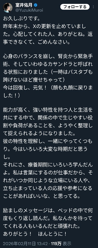 室井佑月「ヨネは発達障害、これからも支えていく」 Twitter Facebook はてブ LINE コピー 2026.02.11 スポンサーリンク 1:それでも動く名無し:2026/02/11(水) 17:42:02.91 ID:XFsx553V0 泣ける 2:それでも動く名無し:2026/02/11(水) 17:43:23.15 ID:DsutBrVN0 見直したわ室井 それに比べて 続きを読む