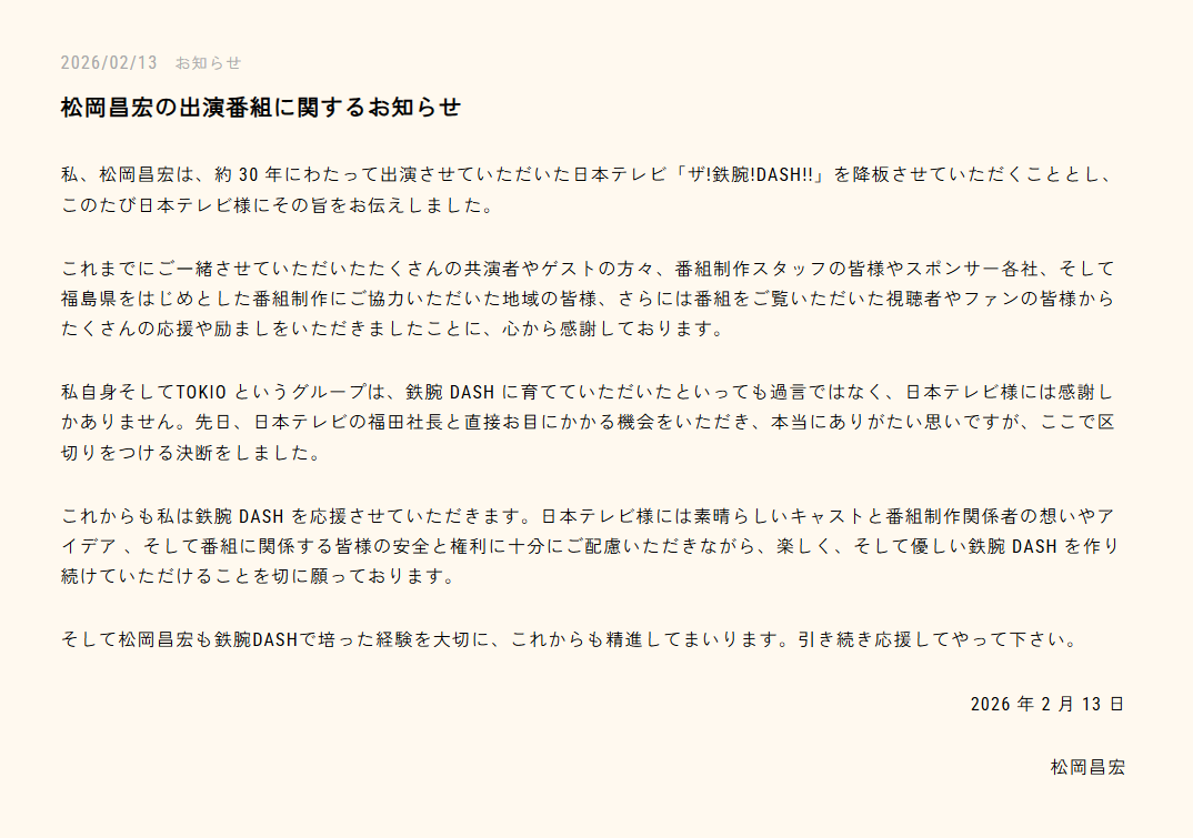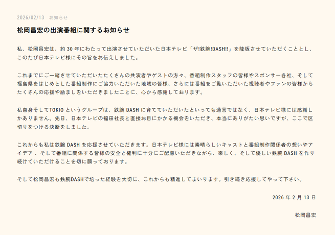 【発表】松岡昌宏『ザ!鉄腕!DASH!!』降板の意向 約30年にわたり出演https://t.co/3gqkWrzEfd