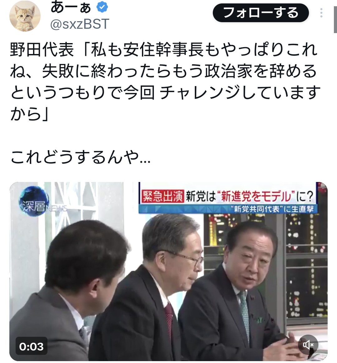 野田代表「私も安住幹事長もやっぱりこれね、失敗に終わったらもう政治家を辞めるというつもりで今回 チャレンジしていますから」