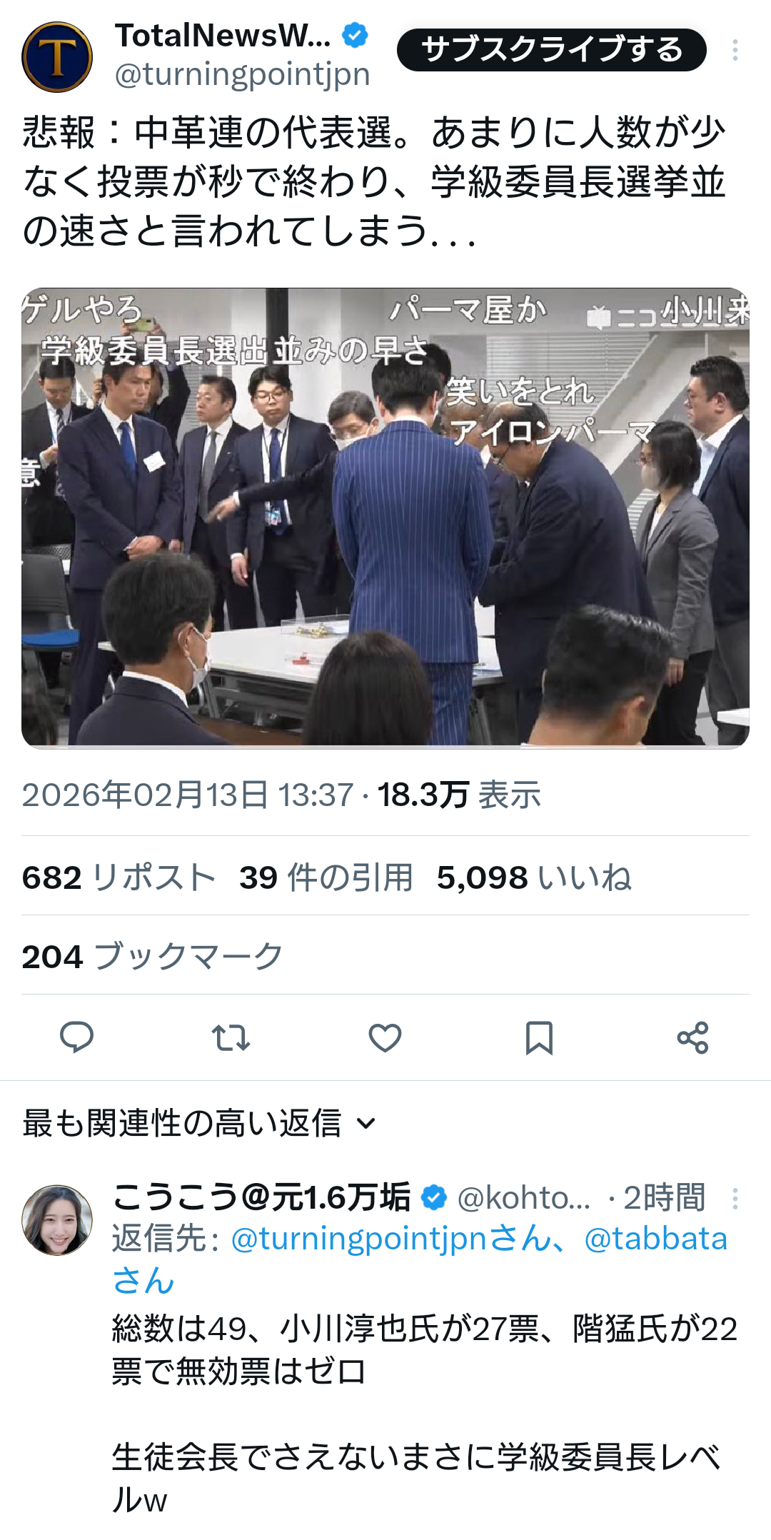 悲報:中革連の代表選。あまりに人数が少なく投票が秒で終わり、学級委員長選挙並の速さと言われてしまう... pic.twitter.com/4BYQvUqlzL