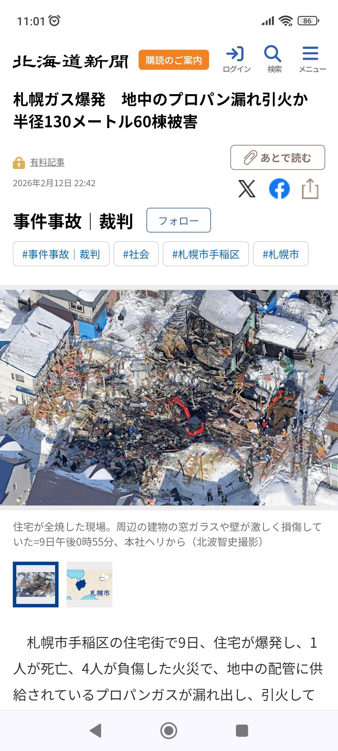 【悲報】札幌の民家火災爆発事故、爆発の原因は道路に埋まったプロパンガス管からのガス漏れ Twitter Facebook はてブ LINE コピー 2026.02.14 スポンサーリンク 1:それでも動く名無し:2026/02/13(金) 11:04:11.49 ID:d40yZnSH0 60世帯に被害って…こっわ… 2:それでも動く名無し:2026/02/13(金) 11:05:00.84 ID:fgcxsoBA0 経年劣化なん? 5:それでも動く名無し:2026/02/13(金) 11:05:55.01 ID:d40yZnSH0 >>2 そうやろな…プロパンやから都市ガスほど管理厳しくないやろし 3:それでも動く名無し:2026/02/13(金) 11:05:37.03 ID:GaU7bUaK0 死んだ人とばっちりやん 可哀想 続きを読む