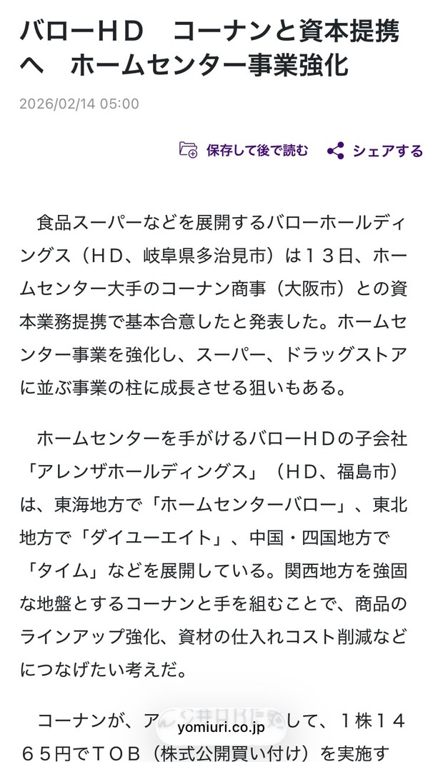 バローHD コーナンと資本提携へ ホームセンター事業強化:地域ニュース : 読売新聞