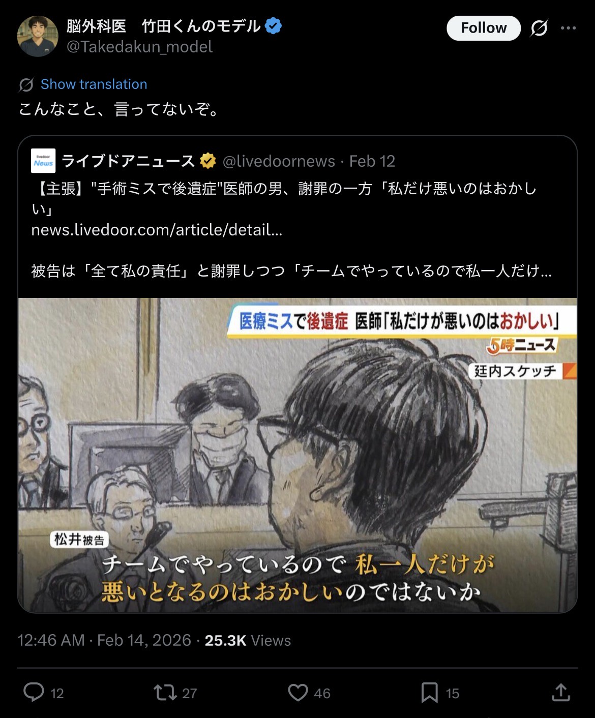 脳外科医 竹田くんのモデル「こんなこと(裁判で)言ってないぞ。」