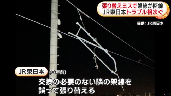 JR東日本によりますと、架線は3年前の時点で既に摩耗が進んだ状態で張り替えることになりましたが、その際に交換の必要のない隣の架線を誤って張り替えていたということです。