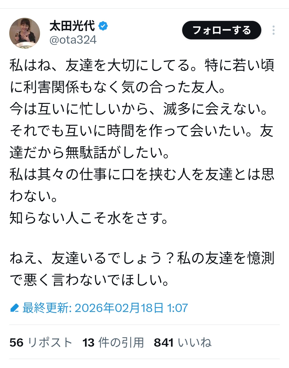 【速報】太田光代さん、蓮舫との関係について言及か「私の友達を憶測で悪く言わないでほしい」