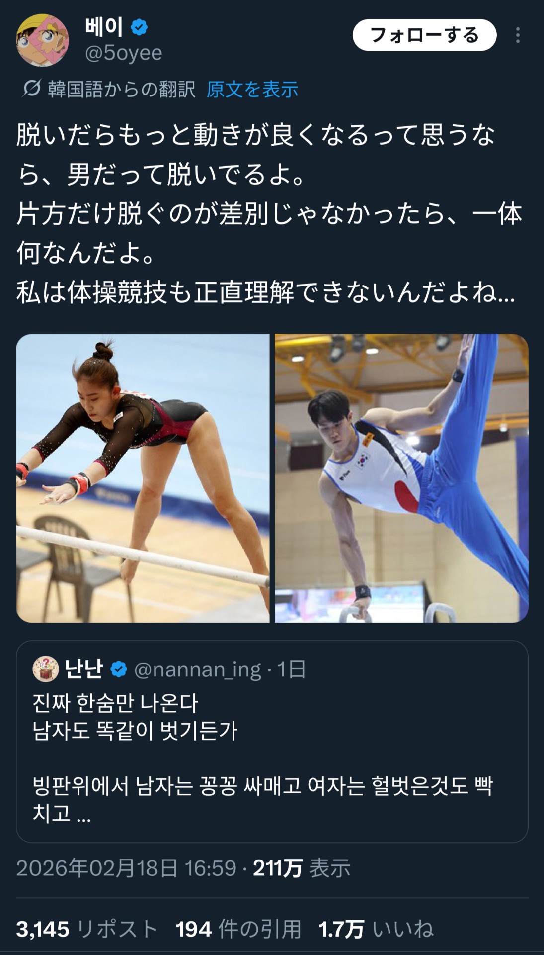 韓国人「体操で女だけエチエチ衣装なのおかしいやろ」 (※画像あり) Twitter Facebook はてブ LINE コピー 2026.02.20 スポンサーリンク 1:それでも動く名無し:2026/02/20(金) 12:24:03.64 ID:jTyaUw/MH 確かに 2:それでも動く名無し:2026/02/20(金) 12:24:39.46 ID:DI5A2bKc0 エチエチで点がとれるならみんな脱ぐやろ 続きを読む