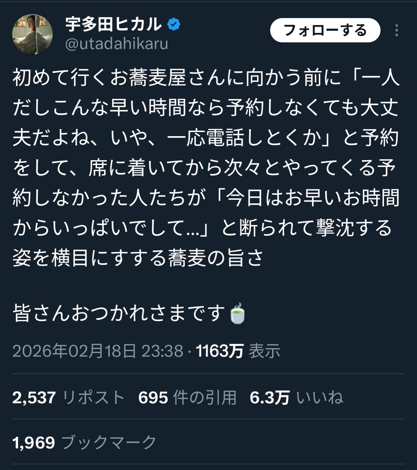 宇多田ヒカルさん、腹黒いツイートをして炎上してしまうwwwwwww Twitter Facebook はてブ LINE コピー 2026.02.21 スポンサーリンク 1:それでも動く名無し:2026/02/19(木) 23:21:32.54 ID:SxN4uiJr0 やってしまいましたなぁ… 2:それでも動く名無し:2026/02/19(木) 23:22:10.28 ID:9N72lDVY0 落ちは? 4:それでも動く名無し:2026/02/19(木) 23:23:44.01 ID:uAFLX1Mg0 母ちゃんも草葉の陰で呆れとるわ 5:それでも動く名無し:2026/02/19(木) 23:23:55.66 ID:6zI2+K4s0 Xでクソ陰謀論者共に絡まれていてストレスなんやろからそいつらのせい 続きを読む