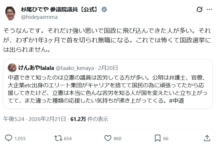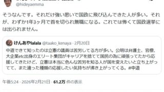 現職国会議員「わずか1年3ヶ月で首を切られ無職になる。これでは怖くて選挙に出られない」 Twitter Facebook はてブ LINE コピー 2026.02.24 スポンサーリンク 1:それでも動く名無し:2026/02/22(日) 15:31:32.49 ID:v26csXv80 2:それでも動く名無し:2026/02/22(日) 15:32:41.00 ID:L/nQO2vI0 その為に高給貰ってるじゃん 3:それでも動く名無し:2026/02/22(日) 15:32:51.62 ID:UzB+IwgZ0 解散総選挙でクビになる そんなことも知らずにやってるガイジいたら死んでほしいw 中核連w 続きを読む