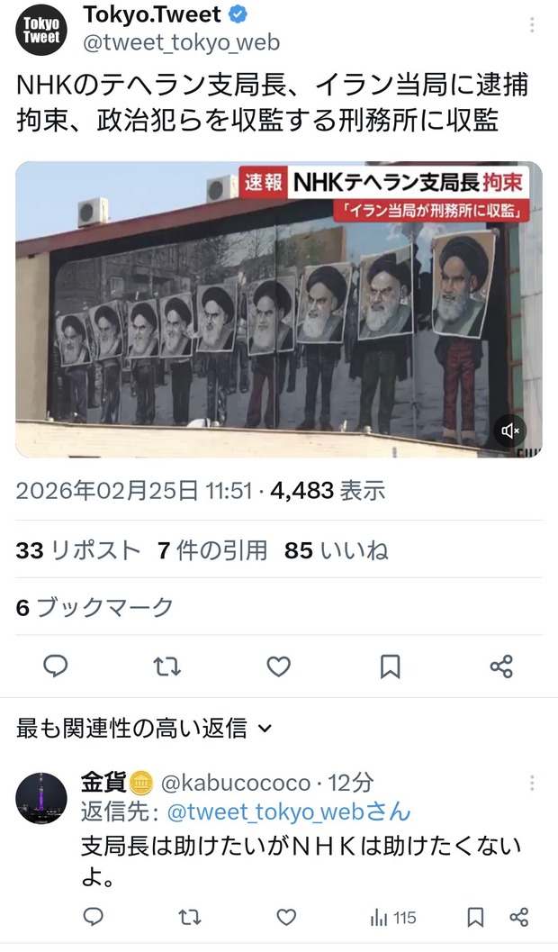 NHKのテヘラン支局長、イラン当局に逮捕拘束、政治犯らを収監する刑務所に収監 pic.twitter.com/ruqxnOQHOe