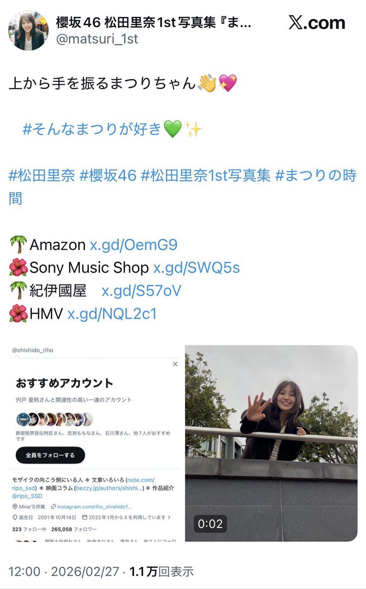 2026年2月27日、櫻坂46キャプテン・松田里奈さんの1st写真集『まつりの時間』公式Xアカウント(@matsuri_1st)が、宣伝投稿の際に大きなミスを犯しました。