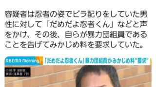 容疑者は忍者の姿でビラ配りをしていた男性に対して「だめだよ忍者くん」などと声をかけ、その後、自ら暴力団員であることを告げてみかじめ料を要求していた。
