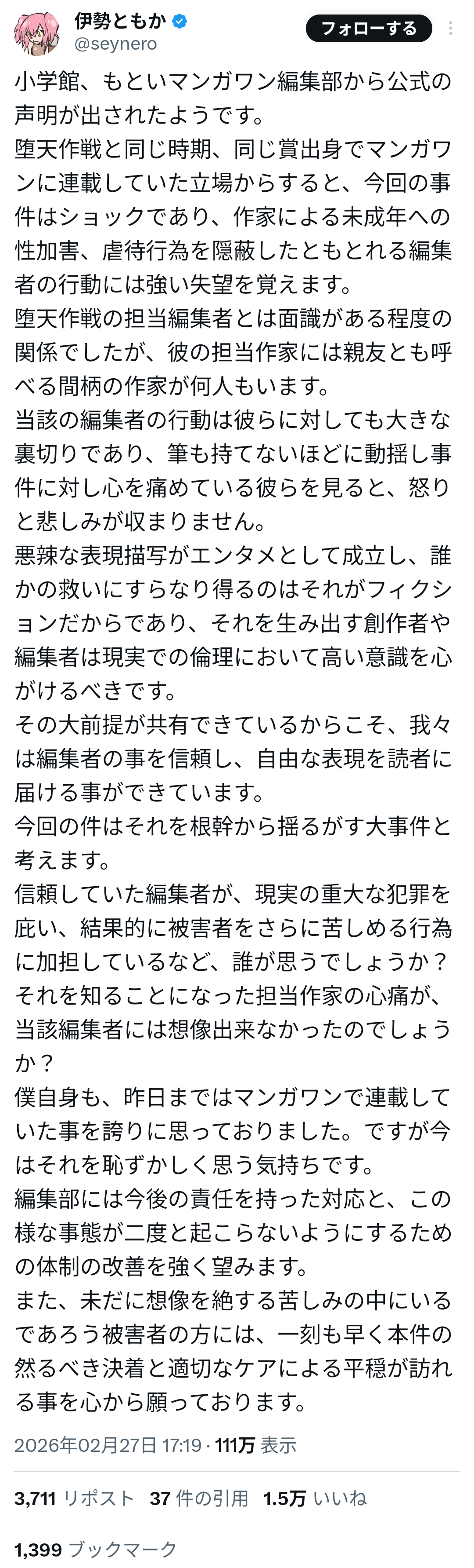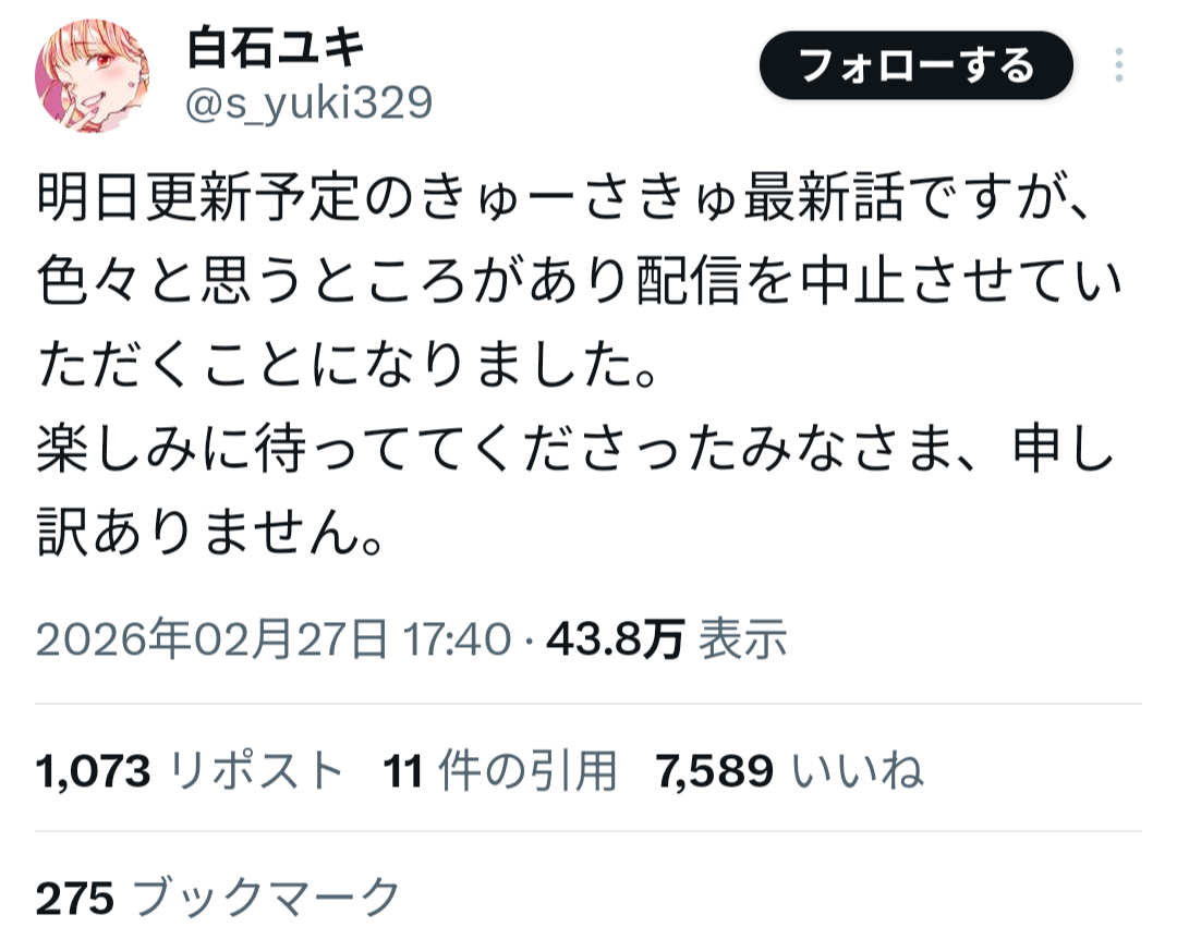 【悲報】小学館マンガワン、完全に逝く……半日で漫画家50人が配信停止表明した模様wwwwwwwwww Twitter Facebook はてブ LINE コピー 2026.02.28 スポンサーリンク 1:それでも動く名無し:2026/02/28(土) 16:18:06.66 ID:T9llN9E40 終わりだよこの出版社 4:それでも動く名無し:2026/02/28(土) 16:19:29.54 ID:T9llN9E40 続きを読む