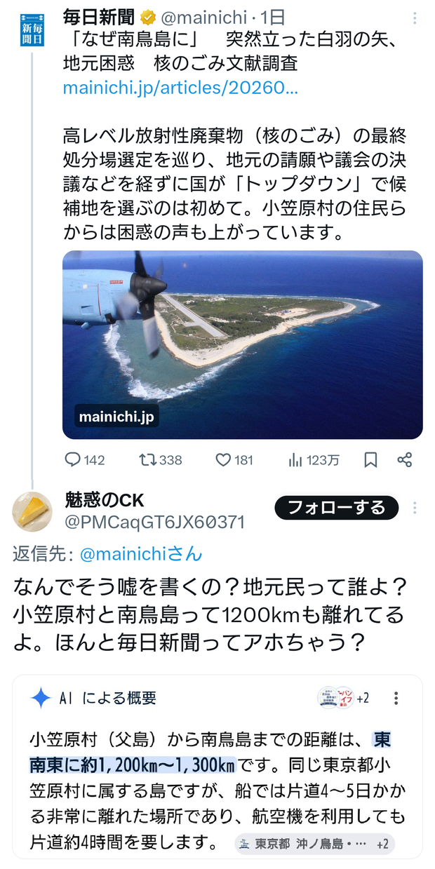 毎日新聞「なぜ南鳥島に…核のごみ文献調査に地元困惑」 ←住民0人の南鳥島の地元?🤔 Twitter Facebook はてブ LINE コピー 2026.03.05 スポンサーリンク 1:2026/03/05(木) 09:11:31.68 ID:WeaR8z8s0南鳥島の付近の地元住民(1200km離れた父島の住人)。こんなの面白過ぎるでしょ記事タイトル・・・ https://t.co/wPE4UZyTZy— JSF (@rockfish31) March 4, 2026転載元スレッド:https://hayabusa3.2ch.sc/test/read.cgi/news/1772669491/ 続きを読む