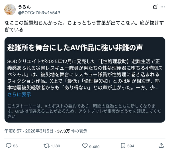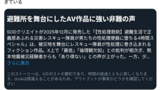 【悲報】AV業界、一線を超え炎上wwwwwwwwww Twitter Facebook はてブ LINE コピー 2026.03.05 スポンサーリンク 1:それでも動く名無し:2026/03/05(木) 14:22:15.21 ID:PUKLP9tp0 2:それでも動く名無し:2026/03/05(木) 14:23:12.53 ID:PuK5SZa90 SODが犯罪被害者そのままネタにして発売禁止に追い込まれてたし今更やろ 5:それでも動く名無し:2026/03/05(木) 14:24:26.21 ID:LaRW7Oxo0 強姦ものはええの? 7:それでも動く名無し:2026/03/05(木) 14:28:05.93 ID:QWF8zcne0 AV業界にモラルがどうたら求めるの草 続きを読む
