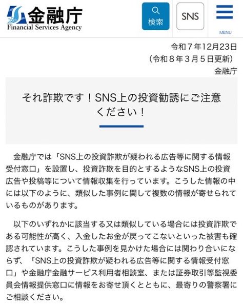 ただし、公式の「無登録業者リスト」(https://www.fsa.go.jp/ordinary/chuui/mutouroku/04.html)にはトークン名や運営者の具体的な記載はまだありません。一方で、3月5日更新の金融庁公式注意喚起ページ「それ詐欺です!SNS上の投資勧誘にご注意ください!」の事例が、サナエトークンの手口にドンピシャで一致すると指摘され、「投資詐欺リスト入り」とバズっている状況です。