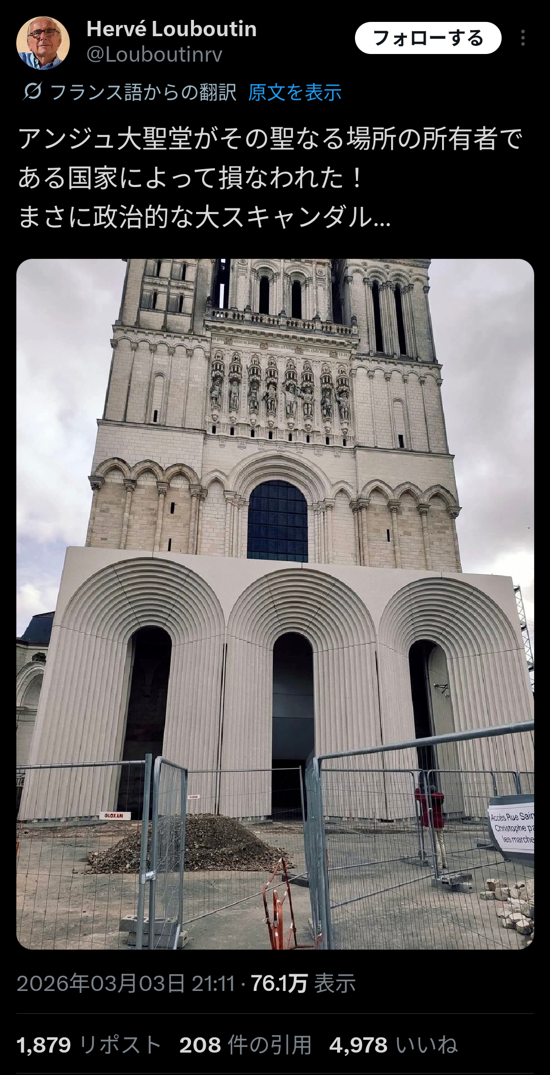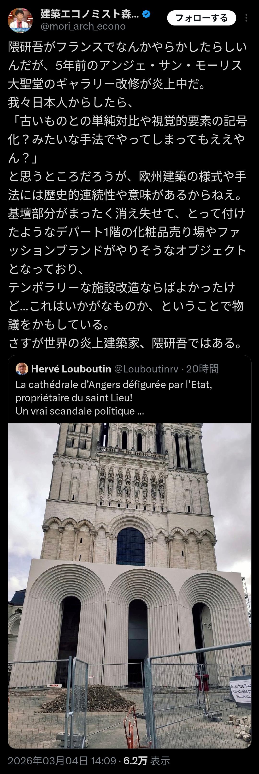 【悲報】隈研吾、フランスの歴史的大聖堂をリフォーム → 現地民ブチギレ炎上www Twitter Facebook はてブ LINE コピー 2026.03.06 スポンサーリンク 1: アビシニアン(茸) [FI] 2026/03/05(木) 15:32:40.38 ID:OSFpkdE30● BE:487816701-PLT(13060) 続きを読む