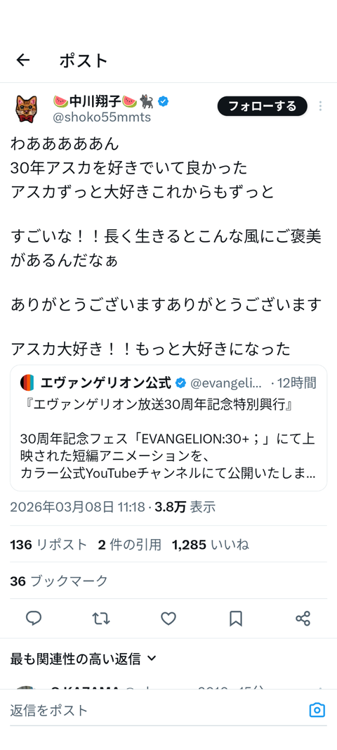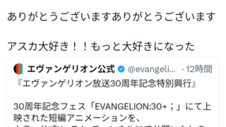 中川翔子「わああああん 30年アスカ好きでよかった」
