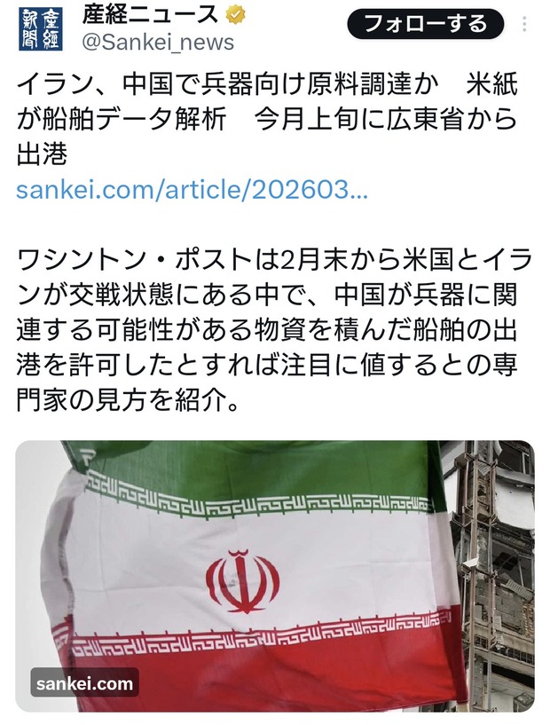 イラン、中国で兵器向け原料調達か 米紙が船舶データ解析 今月上旬に広東省から出港https://t.co/yGIwPiDyCs
