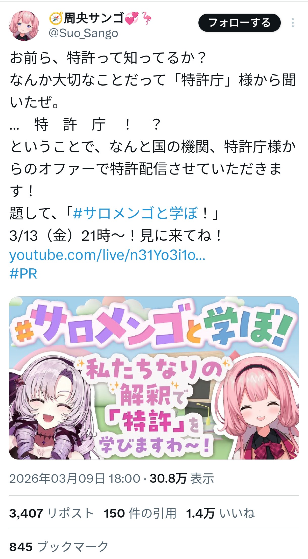 【画像】人気Vチューバーさん、特許庁とコラボwwwwwwwwwwwwwwwwwwwwwwwwwwwwwwwwwwwwwwwwwwwww