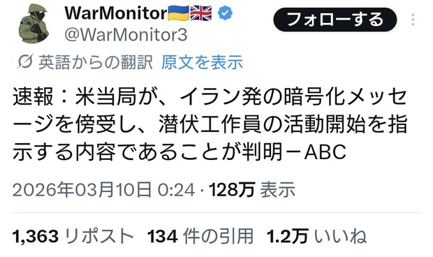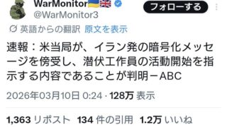 米当局がイラン発の暗号化メッセージを傍受。正規軍ほぼ全滅でここからゲリラ戦を仕掛ける模様 Twitter Facebook はてブ LINE コピー 2026.03.10 スポンサーリンク 1:2026/03/10(火) 12:30:13.16 ID:irF6+Dij0正規軍ほぼ全滅でここからゲリラ戦を仕掛けてくるようです。テロに注意。 https://t.co/UcA3lRazub— 上念 司 (@smith796000) March 9, 2026転載元スレッド:https://hayabusa3.2ch.sc/test/read.cgi/news/1773113413/ 続きを読む