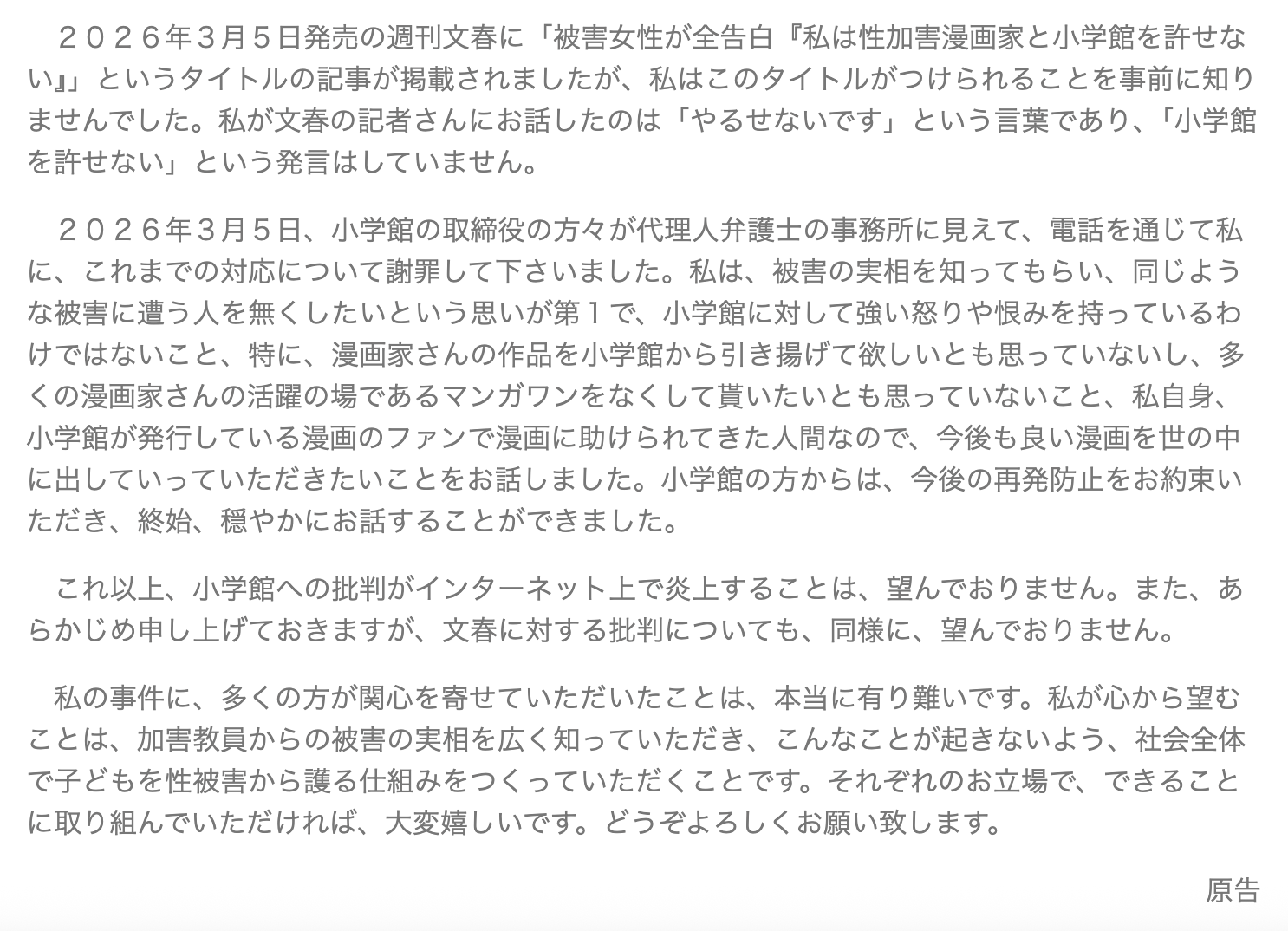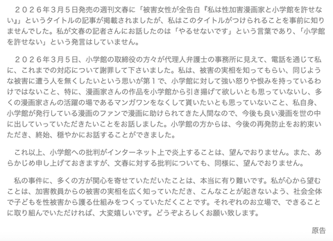 被害者は堕天作戦の作者のことは絶対許せないが特に小学館に対する炎上は望んでなかった模様
