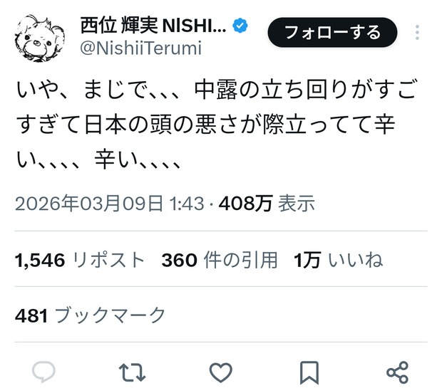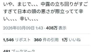 アニメーターさん、中露をベタ褒めしたところ過去のフェミ発言を掘られて炎上 Twitter Facebook はてブ LINE コピー 2026.03.11 スポンサーリンク 1 : 以下、?ちゃんねるからVIPがお送りします :2026/03/11(水) 01:38:22.268 ID:8TDPwmtHM.netなんかアニメーターってアレな人多くね?↓↓転載元スレッド:https://viper.2ch.sc/test/read.cgi/news4vip/1773160702/ 続きを読む