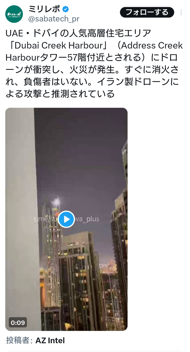 UAE・ドバイの人気高層住宅エリア「Dubai Creek Harbour」(Address Creek Harbourタワー57階付近とされる)にドローンが衝突し、火災が発生。すぐに消火され、負傷者はいない。イラン製ドローンによる攻撃と推測されているpic.twitter.com/StgewREIBb https://t.co/Ygkb3GPXZS