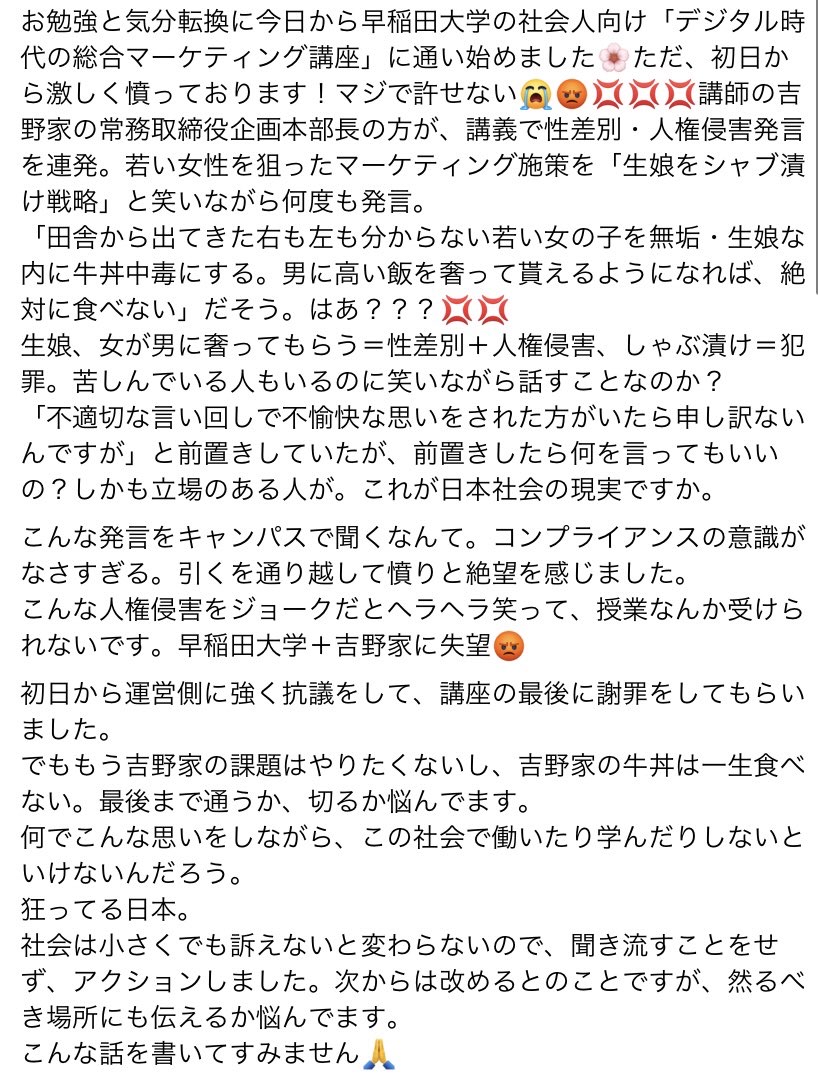 吉野家、幹部不適切発言で19日の親子丼会見中止 早大は講師から解任も検討