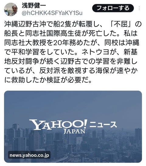 元共同通信&元同志社教授「辺野古移転反対派を敵視する海保が速やかに救助したか検証が必要だ」